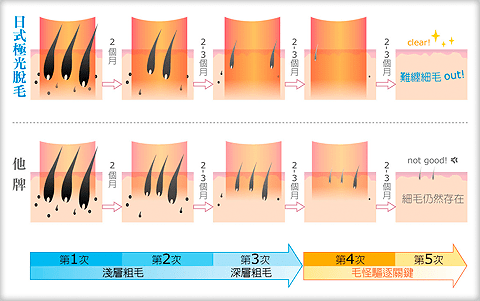 當皮膚受到上特定波長光線大量照射時,光線會穿透皮膚到達皮膚內有些傾斜的毛根上,使毛根溫度升高。當毛根升至高溫時與其接觸的毛囊也會變成高溫。日式極光除毛的目標是位置為毛囊母細胞,也就是毛髮生長發源地,我們的目的便是利用毛囊黑色素吸收來自日式極光除毛的能量,透過高溫針對深層毛囊加熱破壞,使毛囊母細胞萎縮,造成毛髮再生功能逐漸喪失,進而達到長效持久脫毛的效果。