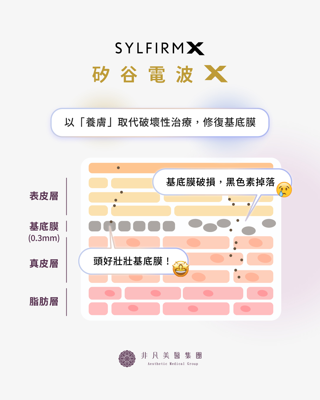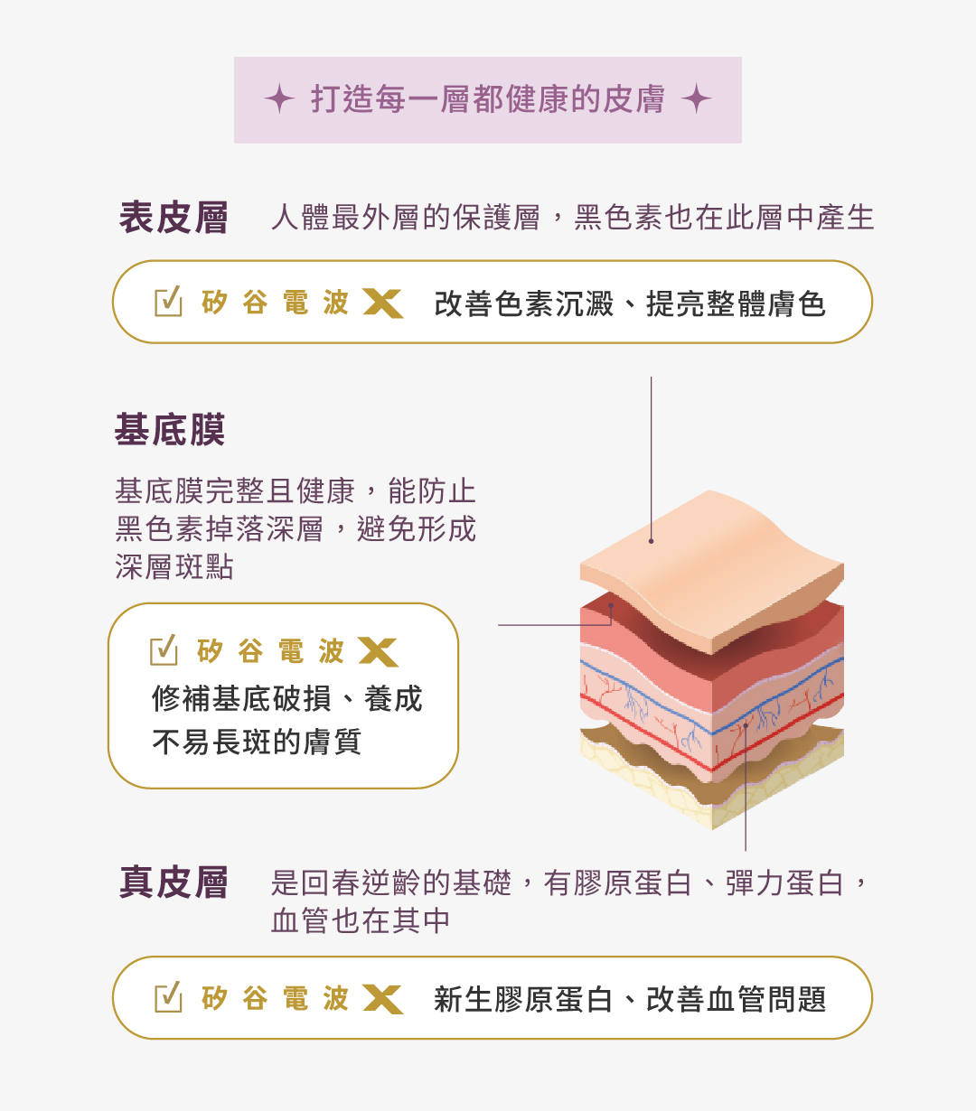 當色素因為基底膜受損,掉入真皮層或肌膚的更深層,就會形成斑點甚至是頑固肝斑,也會開始出現難纏的慢性泛紅與敏感肌等問題,而強調從根本養膚的矽谷電波,就是能針對基底膜進行深度重建的指標性療程。